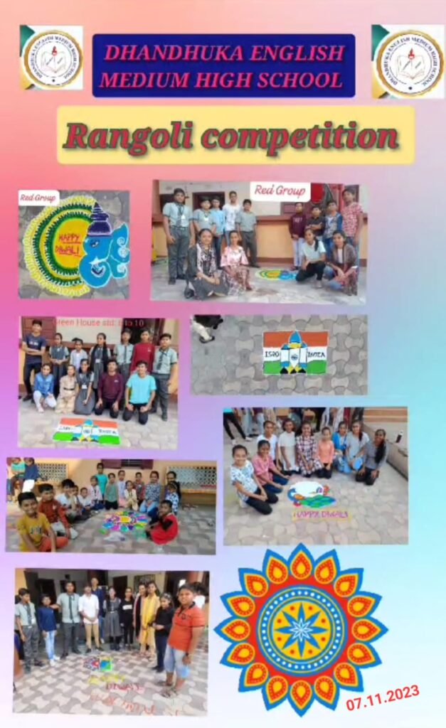 *Diya decoration and Rangoli making Competition* DEMHS organised Diya decoration and Rangoli making competition on 7th November 2023 to promote these traditional arts amongst the students. Students of different houses made beautiful Rangoli designs using bright colours. The idea was to encourage the students to think in an innovative manner.